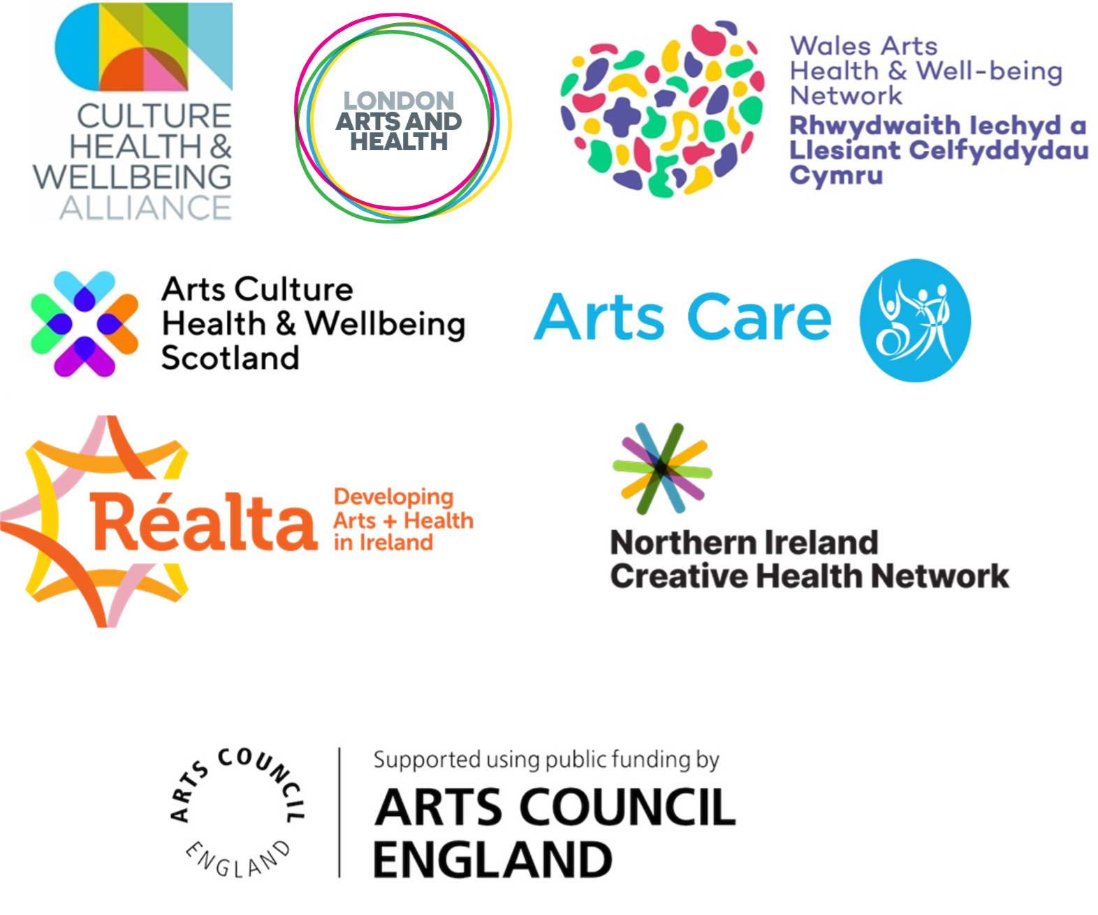 This is a partnership between the Culture, Health & Wellbeing Alliance, the Wales Arts, Health & Wellbeing Network, Arts, Culture, & Wellbeing Scotland, Arts Care (Northern Ireland), the Northern Ireland Creative Health Network, Réalta, and London Arts and Health. Funded by Arts Council England.