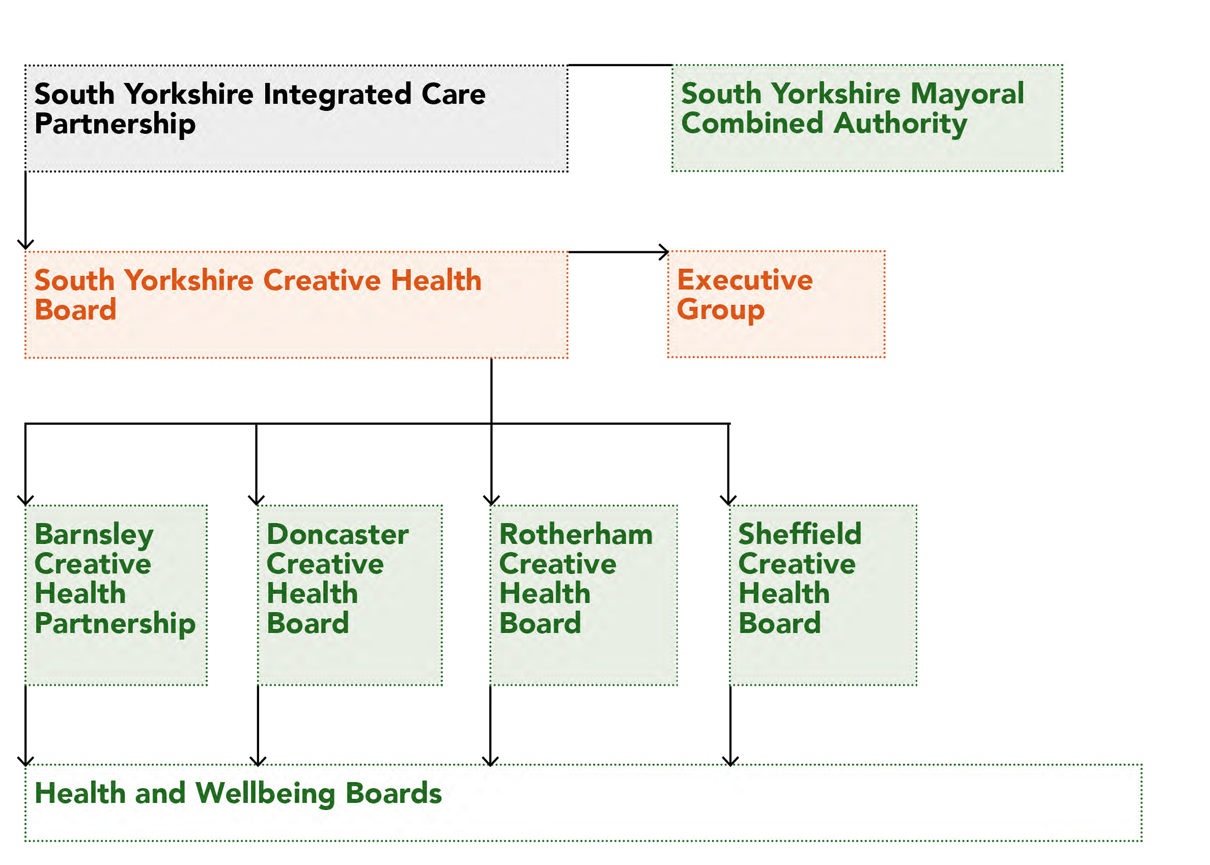Since 2023 the South Yorkshire Creative Health Board has acted as a vehicle to bring together creative health across the four boroughs in South Yorkshire, represented by the Barnsley Creative Health Partnership, Doncaster Arts & Health Board, Rotherham Creative Health Board and Sheffield Creative Health Board.